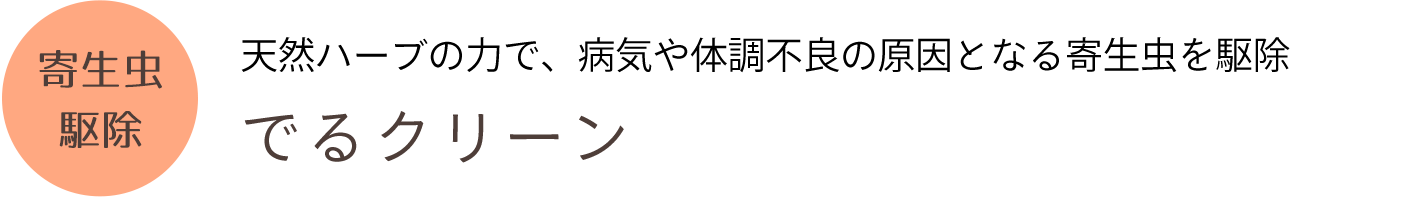 「でるクリーン」は数十種の良質なハーブをもとに作られた天然の虫下し。寄生虫の駆除だけでなく、その卵や幼虫の駆除にもしっかり働きます。