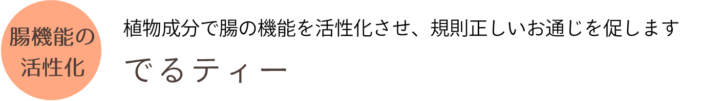 宿便を排出するだけでなく、毎日の規則的なお通じで宿便の溜まらない腸にすることが必要です。 「でるティー」は整腸作用のあるハーブを加えたお通じを促すハーブティー。飲むだけでより優しく効果的に作用し定期的なお通じへ改善します。また下剤的な効果もあり腸内だけでなく腎臓や肝臓、血液の解毒を助けます。カモミールなどのハーブには神経鎮静作用もあるので、就寝前に飲むと心地よい安眠も得られます。