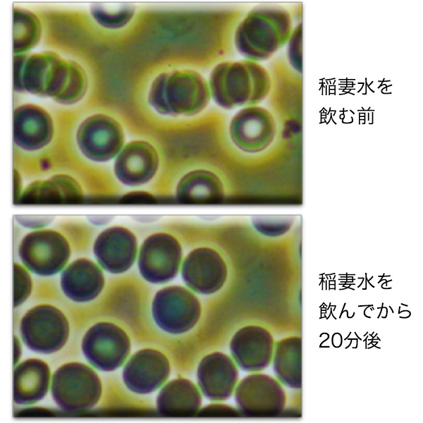稲妻水を飲む前は、赤血球が重なり合い、 |