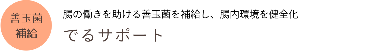 人間の腸内にはもともと体に良い働きをする善玉菌(プロバイオティクス)がいます。ところが古い食物残渣や宿便などが溜まってくると毒素を出すなど悪い働きをする悪玉菌が増えるばかりか、逆に善玉菌が減って腸内細菌バランスが崩れ不健康になるのです。そんな時「でるサポート」が役立ちます。たった1粒で10種類の善玉菌・プロバイオティクスが40億個以上も摂取でき、食べ物の分解や消化吸収、解毒効果を高めます。同時に悪玉菌の勢力を弱めるので、腸内細菌のバランスを保ち環境を健全化します。でるもんねプログラムは「でるミックス」「でるクリーン」ですっきりきれいになった腸に善玉菌を補給するから、より効果的なのです。