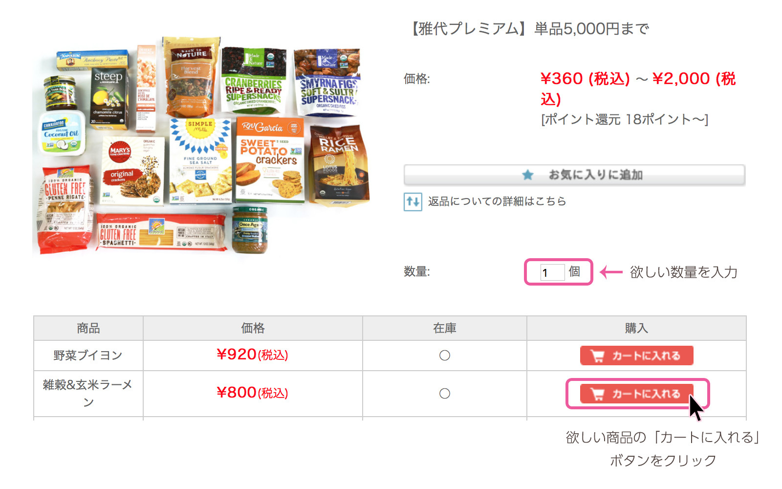 ご希望の数量を入力して、ご希望の商品の「カートへ入れる」のボタンをクリックしてください。