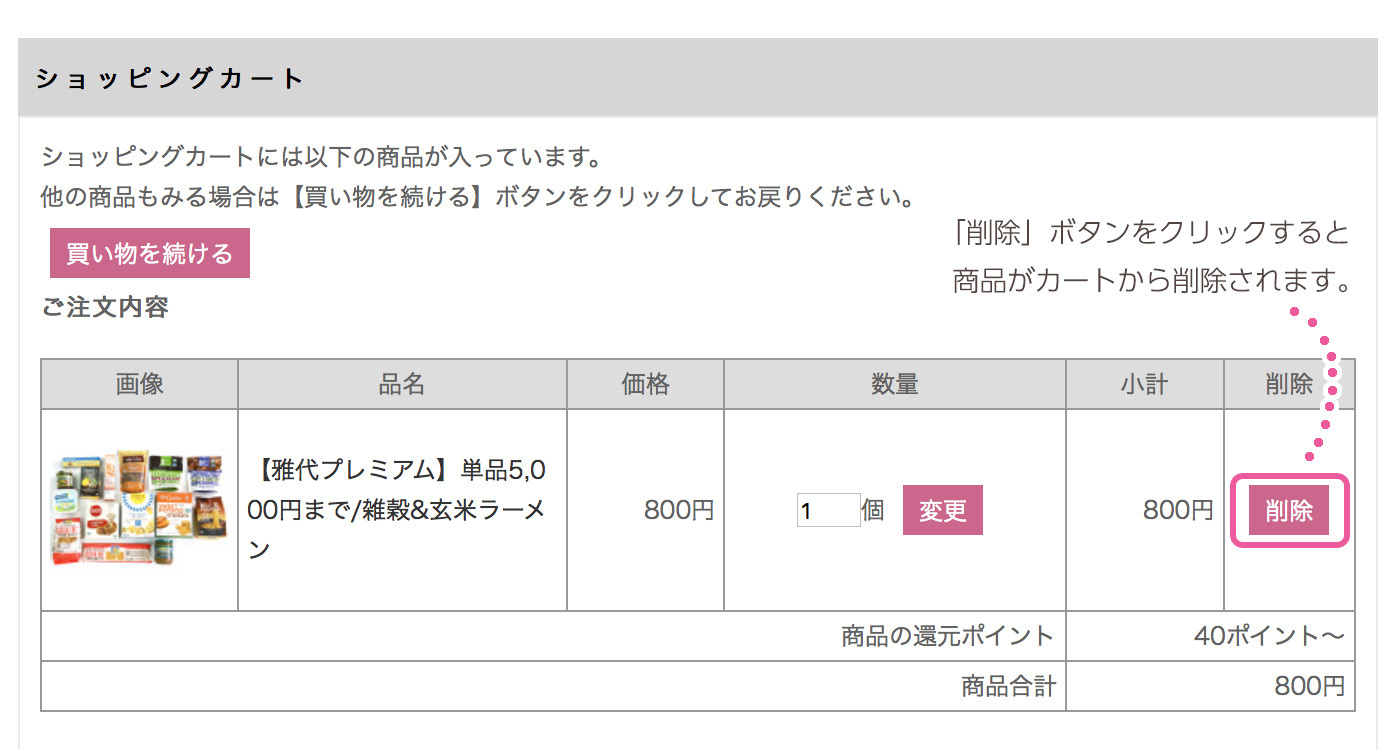 下記のような画面が表示されますので、追加したい商品がある場合は、「買い物を続ける」ボタンをクリックして、商品を追加してください。