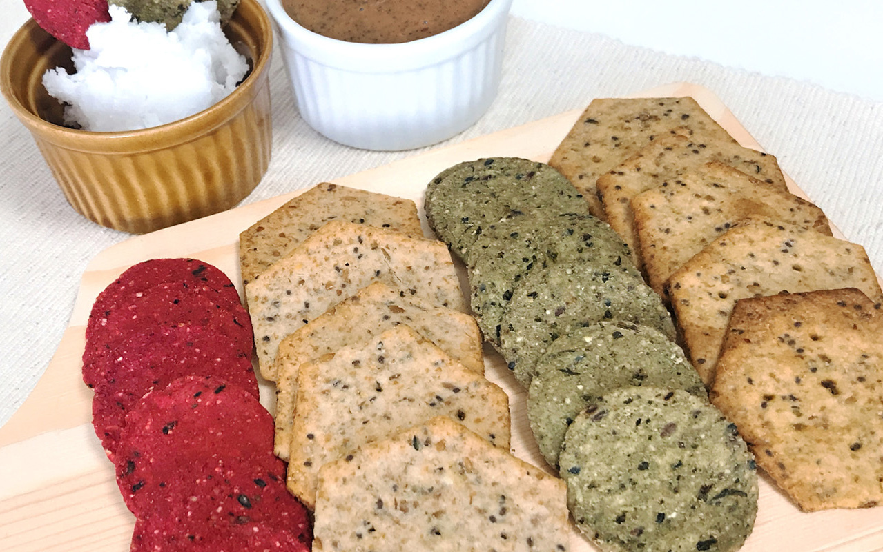 美肌効果・生活習慣病予防効果がある亜麻の種、黒ゴマ、チアシードが入ったグルテンフリーのクラッカー。