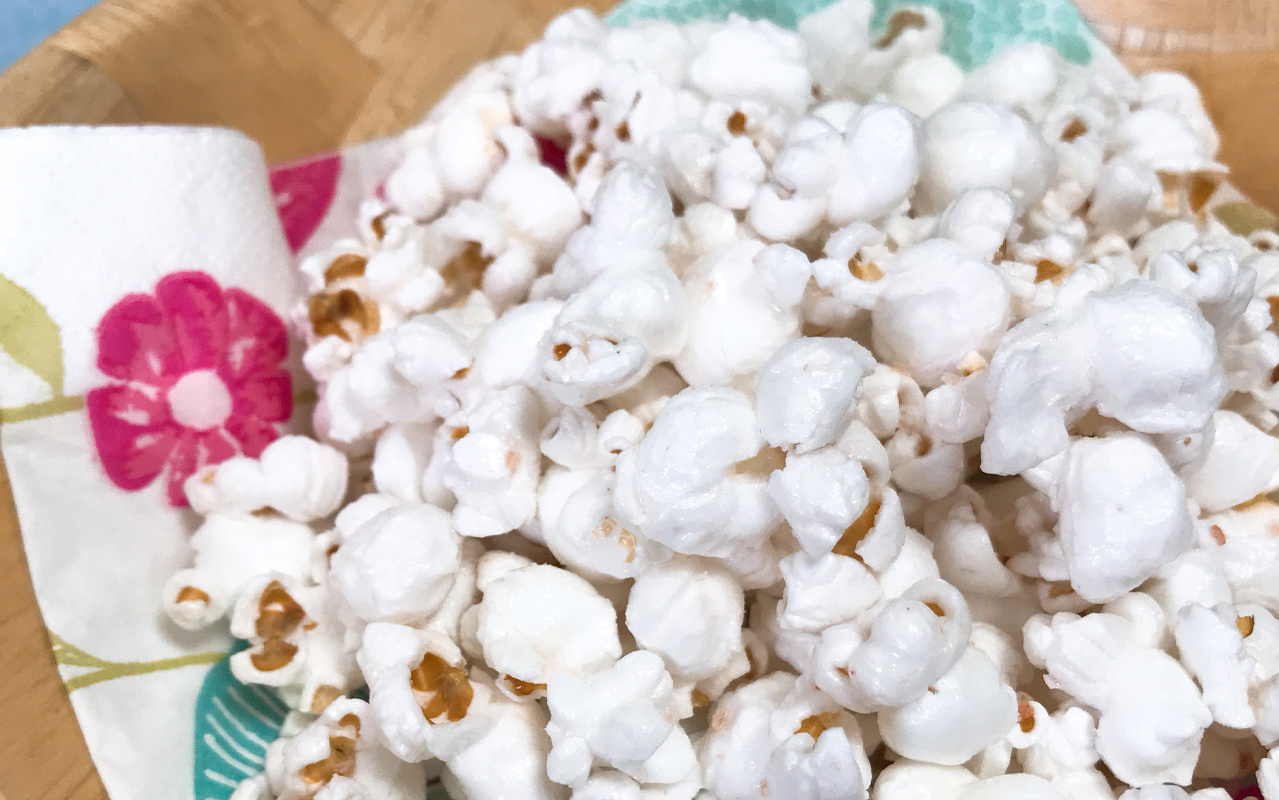 溶かしたココナッツオイル(脂肪を燃焼させダイエットに最適)とポップコーンを、大きなボウルかビニール袋に入れて混ぜる。美味しい塩を少し加える。