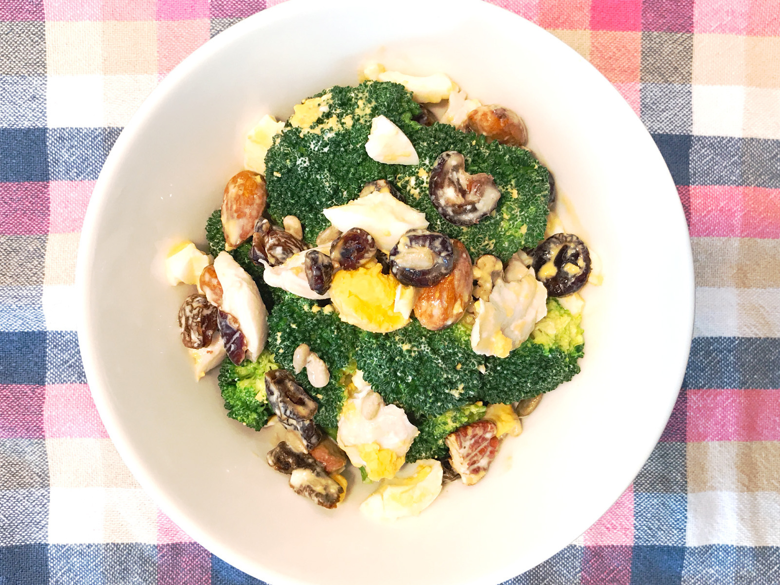 ブロッコリーを食べやすい大きさに切り、玉ねぎと食べやすい大きさにした鶏肉を加え、マヨネーズ、酢、砂糖を混ぜたもの、塩少々、乾燥クランベリーを全部混ぜ合わせるだけ!★時間が経つと味が馴染み、より美味しくなる。