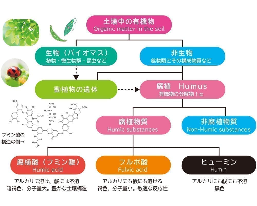 集積した動物や植物の遺骸が、微生物によって、分解・発酵を繰り返しながら長い年月をかけて形成される自然界の再生循環の生命力「腐植物質」に含まれる、「フルボ酸」と「フミン酸」 。