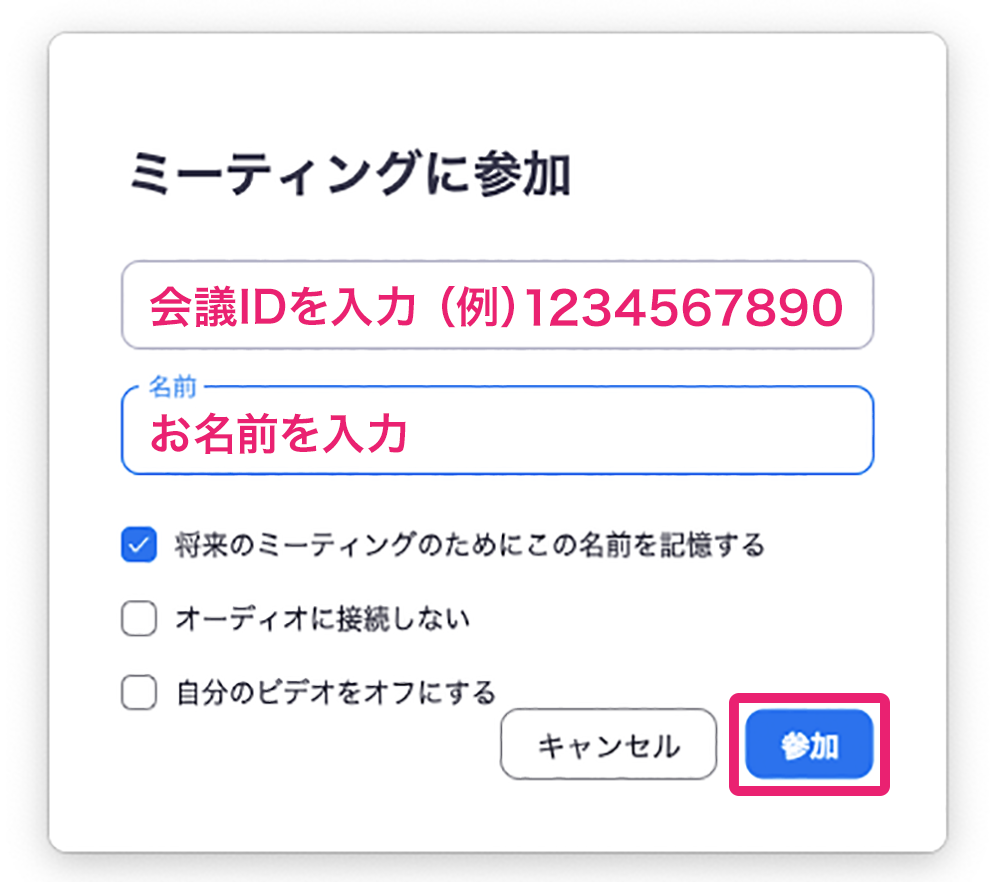 自動でZoomアプリが開いたら お名前 と メールアドレス を入力します。お名前はフルネームでもニックネームでもOK!参加者に表示されます。