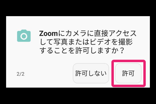 ①「Zoomへのアクセス」「カメラにアクセス」「マイクにアクセス」などの確認メッセージが表示されたら、許可する・しない を選択します。