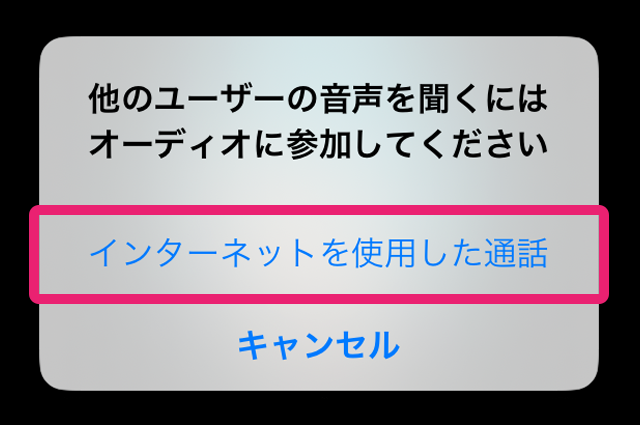 ②「他のユーザーの声を聞くにはオーディオに参加してください」と表示されたら インターネットを使用した通話 をタップします。